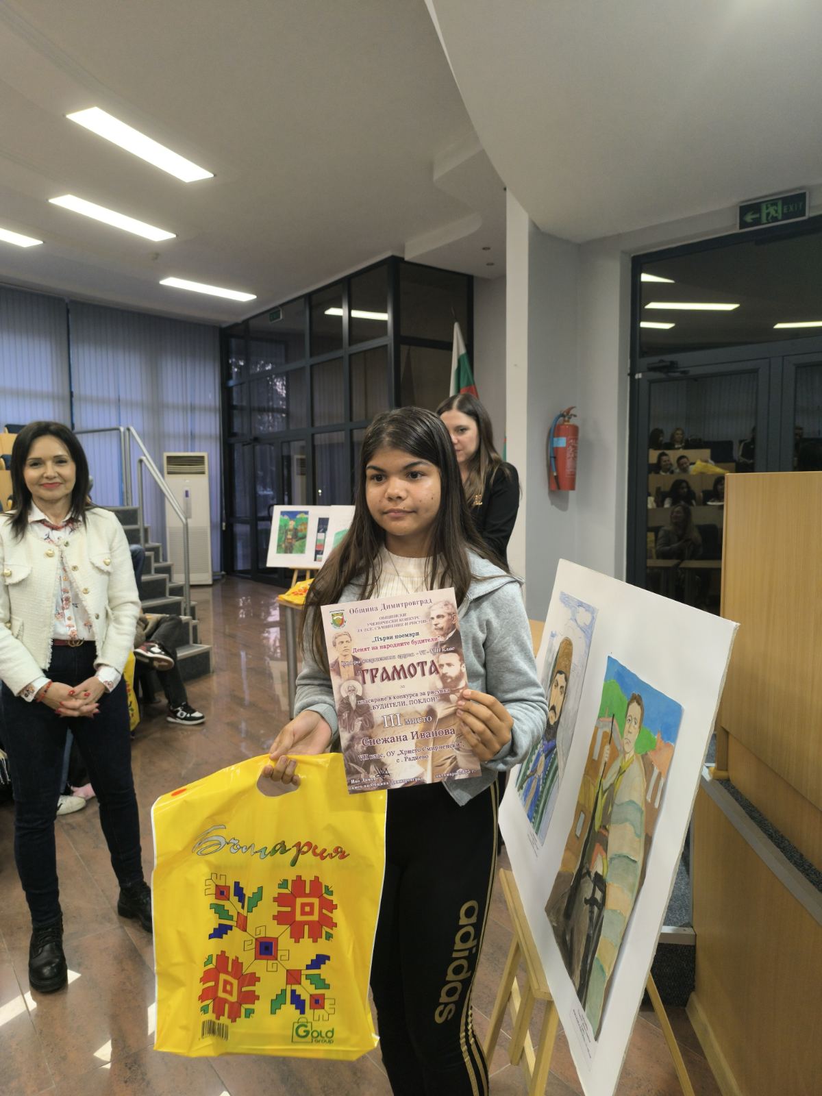 Награда от общинският конкурс "Будители - поклон" получи ученичката от 7 клас - Снежана Иванова. Тя взе трето място при доста голяма конкуренция и доста хубави рисунки.