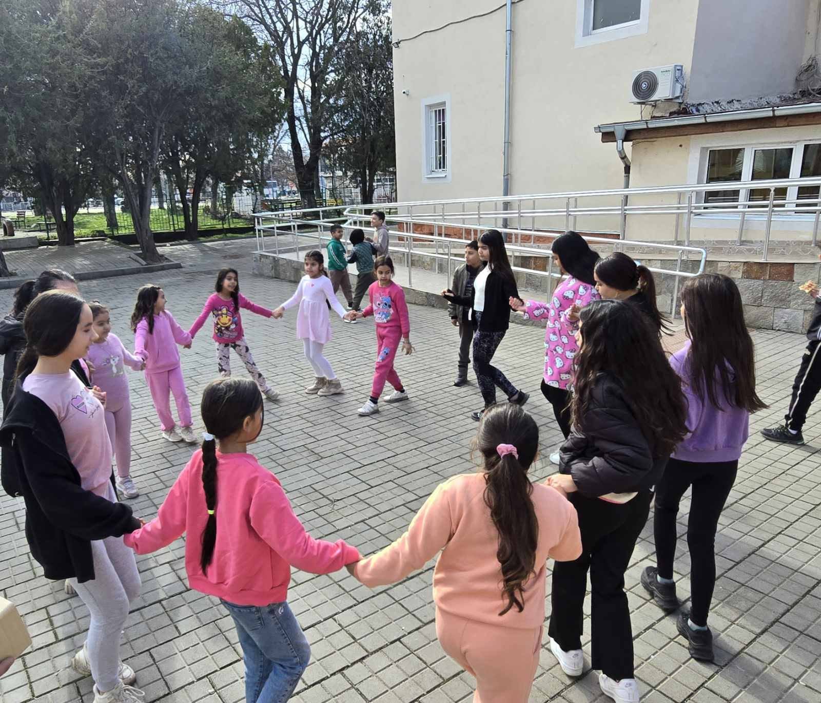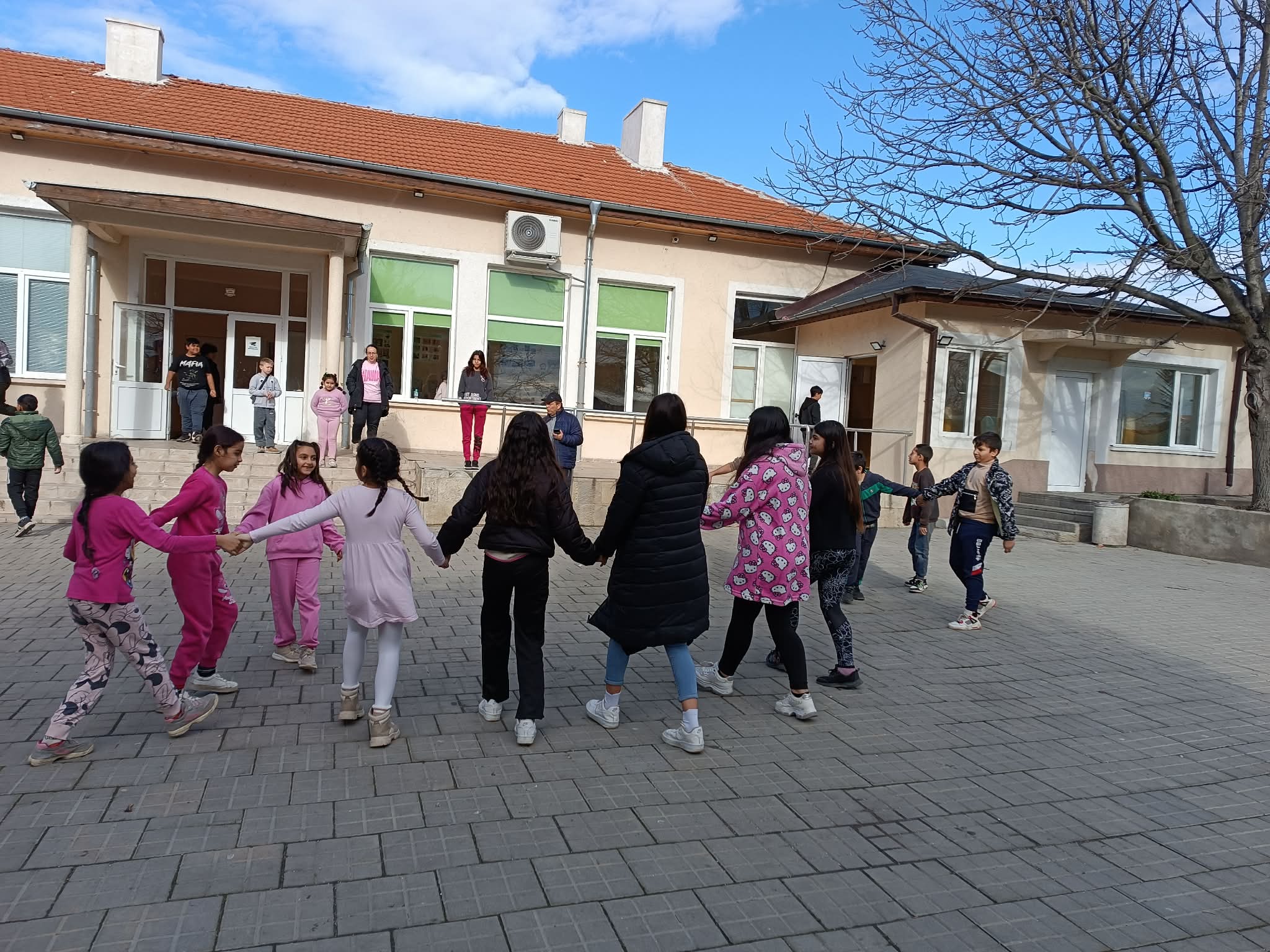 В голямото междучасие училищният двор се изпълни с усмивки и позитивни емоции. Всички ученици се хванаха за ръце и заедно изиграха български хора, символ на единството и сплотеността. С този красив жест те показаха, че когато сме заедно, можем да се противопоставим на агресията и да изградим общност, в която всеки се чувства приет и ценен.