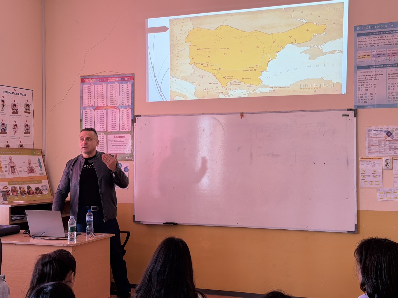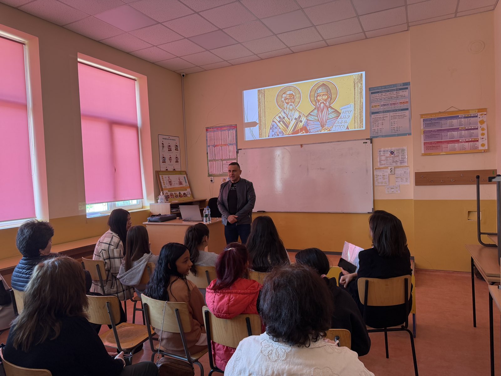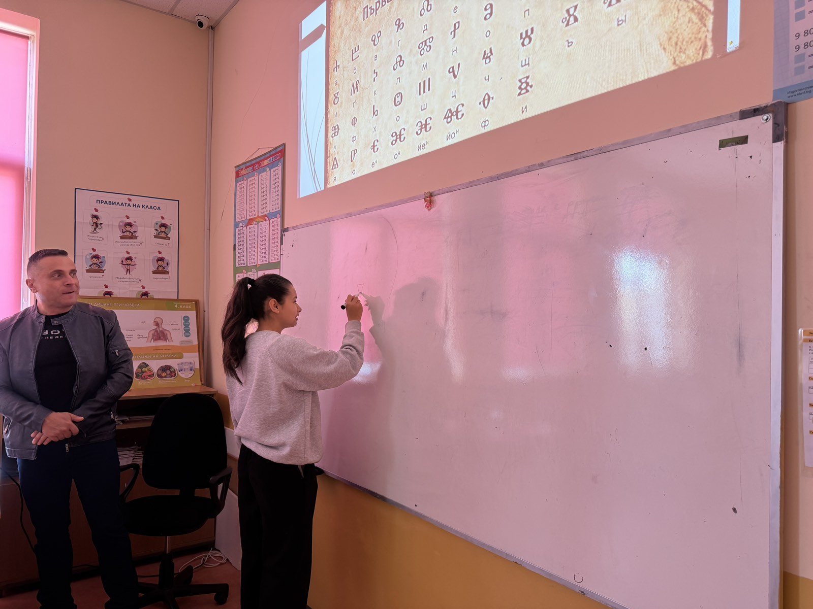 Във връзка с кампанията "Походът на книгите" и инициативата "Известни българи четат на децата" в ОУ "Христо Смирненски" се проведе среща на учениците от прогимназията с изтъкнатия преподавател, автор и преводач Борислав Борисов от СУ "Климент Охридски". В своята задълбочена и увлекателна беседа гостът представи делото на създателите на българската азбука, като проследи развитието на глаголицата и кирилицата и тяхното значение за културната и духовната идентичност на българския народ. Особено внимание беше отделено на приноса на българските ученици на Кирил и Методий, които полагат основите на книжовните школи и утвърждават писмеността като средство за духовно извисяване и просвета. Лекторът говори за силата на образованието и четенето като основа за изграждане на мислещи, знаещи и отговорни личности. Учениците слушаха с интерес и активно се включваха, като задаваха въпроси и споделяха своите впечатления.
