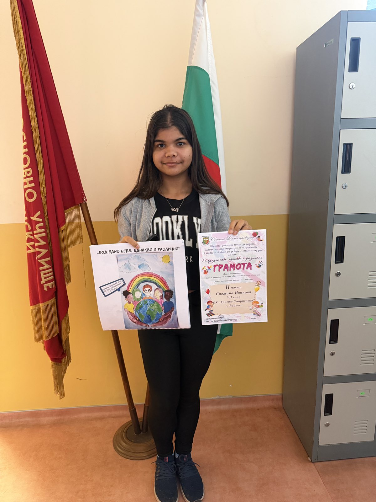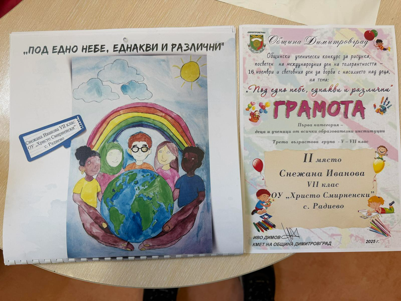 Ученичката Снежана Иванова от 7 клас се класира на второ място в общинския ученически конкурс за рисунка „Под едно небе, еднакви и различни“. Конкурсът е посветен на Международния ден на толерантността – 16 ноември, както и на Световния ден за борба с насилието над деца.
