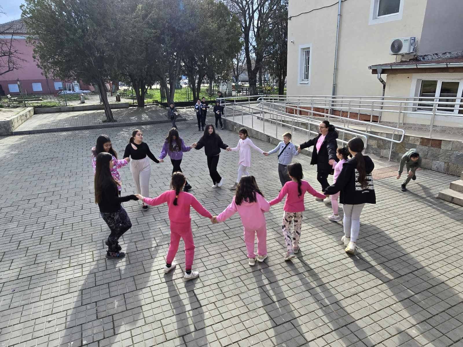 В голямото междучасие училищният двор се изпълни с усмивки и позитивни емоции. Всички ученици се хванаха за ръце и заедно изиграха български хора, символ на единството и сплотеността. С този красив жест те показаха, че когато сме заедно, можем да се противопоставим на агресията и да изградим общност, в която всеки се чувства приет и ценен.