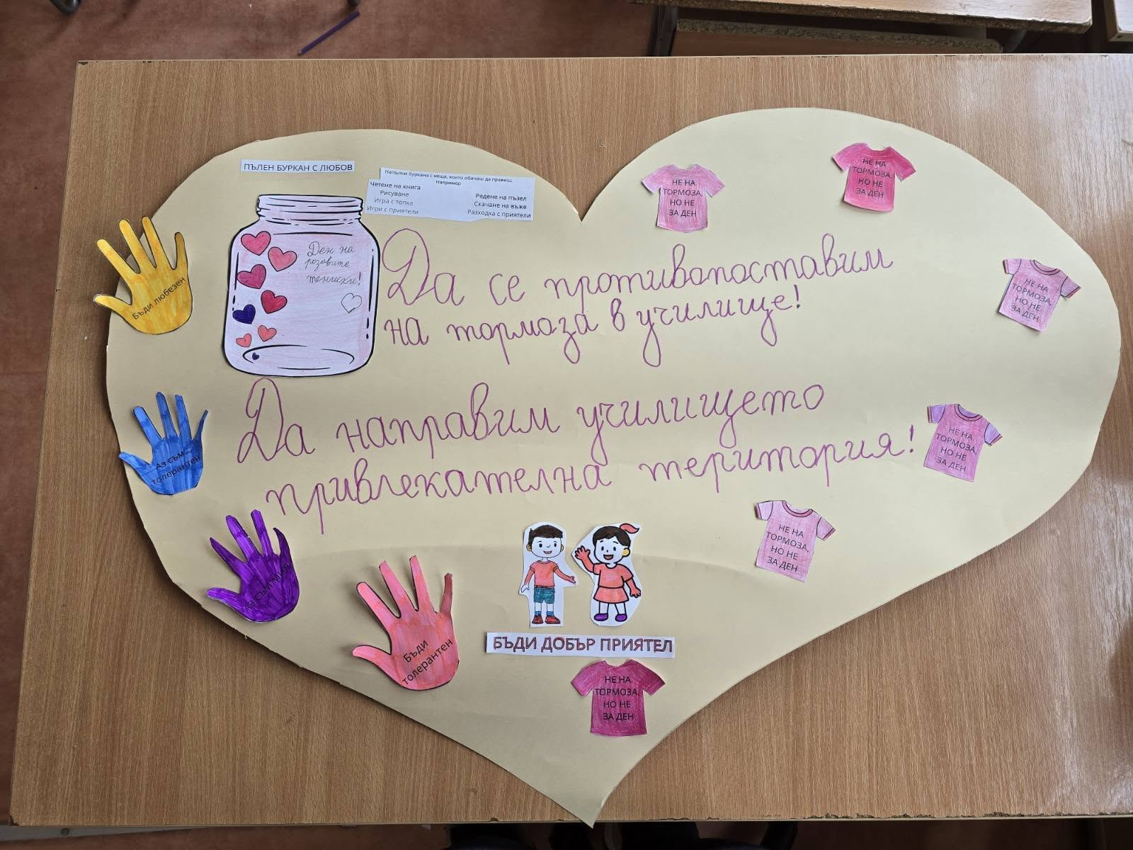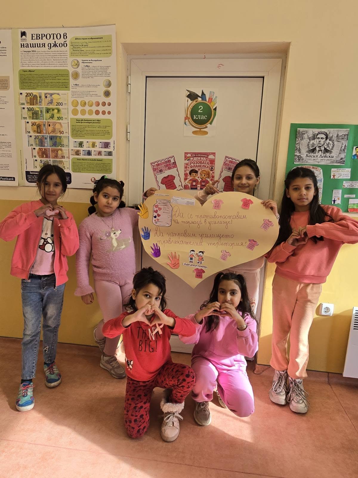 Децата носеха отличителни розови лентички, а част от тях бяха облечени в розово в знак на съпричастност към каузата. Предварително учениците бяха изработили и тематични постери с послания за доброта, разбирателство и подкрепа, които украсиха училището и напомниха на всички колко важно е да бъдем добри един към друг.