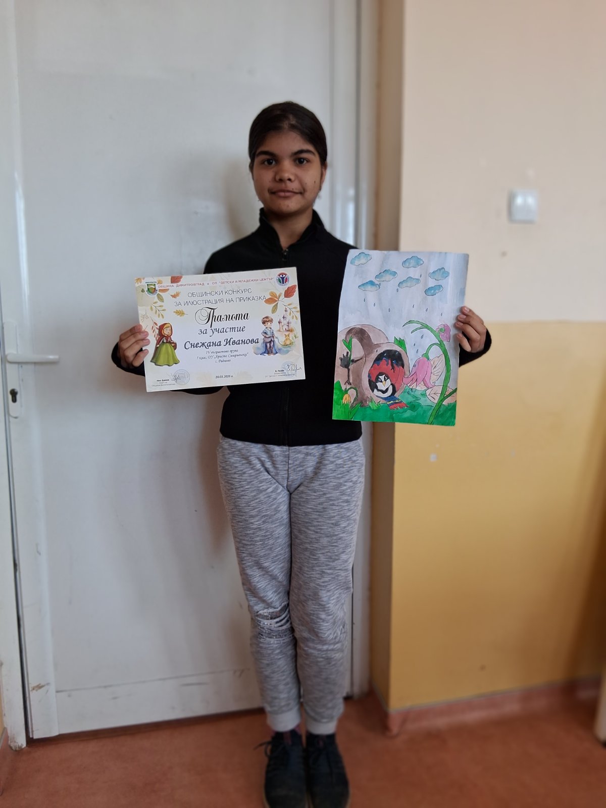 Седмокласничката Снежана Иванова беше отличена с грамота за участието си в общинския конкурс за илюстрация на приказка,организиран от ОП "Детски и младежки център"-Димитровград. Със своята творческа интерпретация тя показа въображение, талант и отношение към темата.